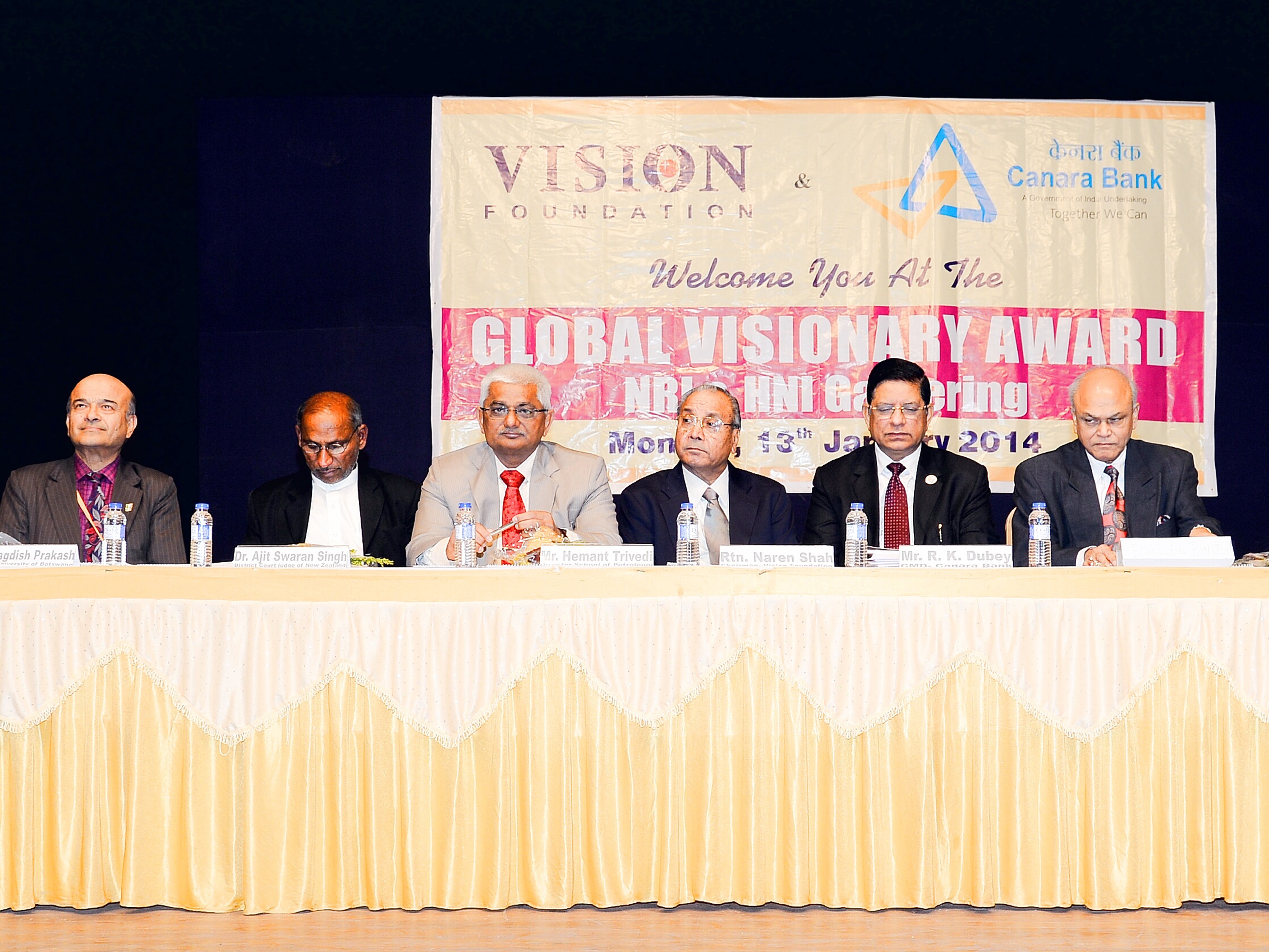 Right side - Mr. Bhailal Patel, Executive Vice President, Parikh Worldwide Media LLC. Ex. Chairman Mr. R K Dubey, Canara Bank. Mr. Naren Shah, Vision world Academy. Left Side- Prof. J. Prakash, University of Botswana. Mr. Hemant Trivedi, Director School of Petroleum Management, Ex. Judge New Zealand .