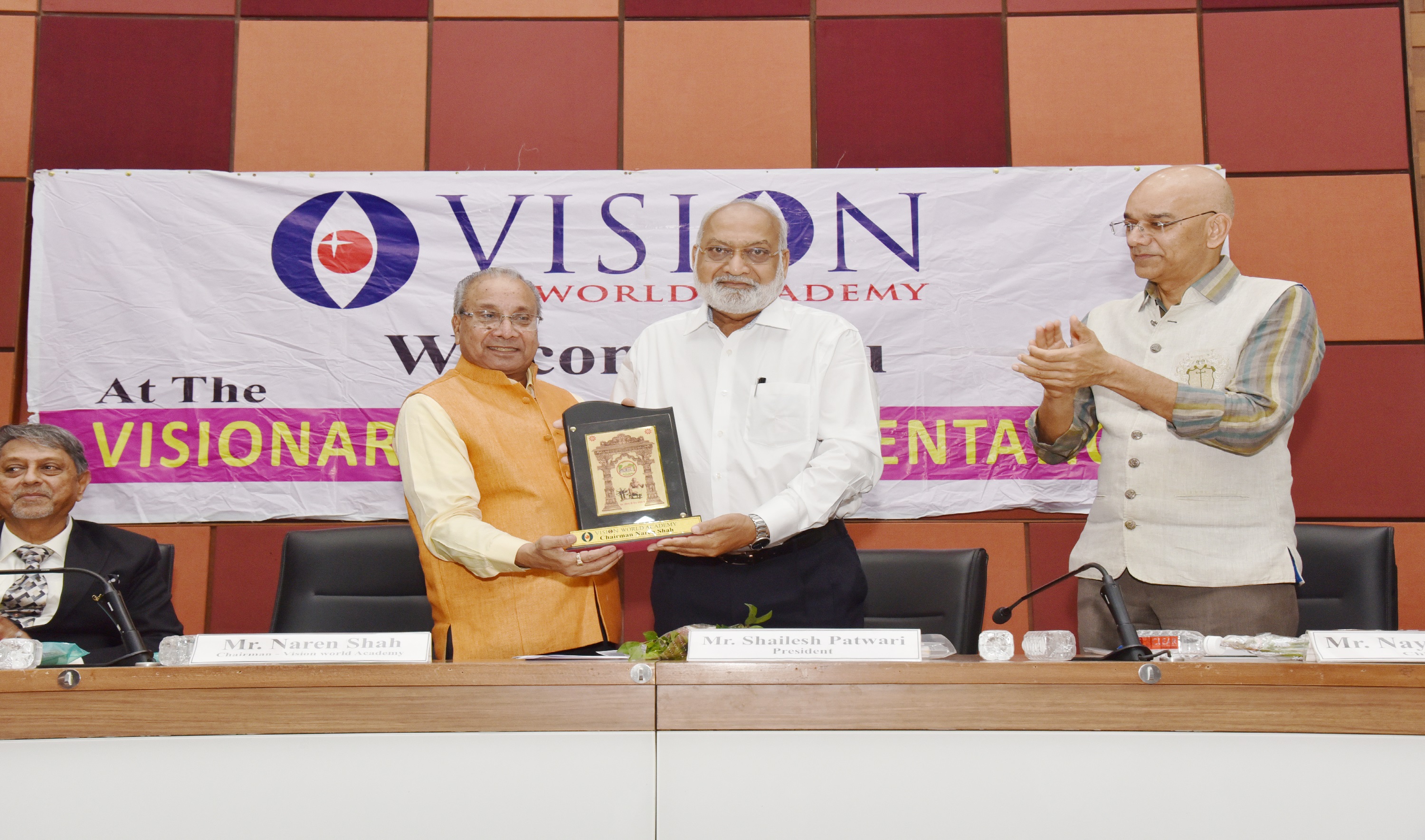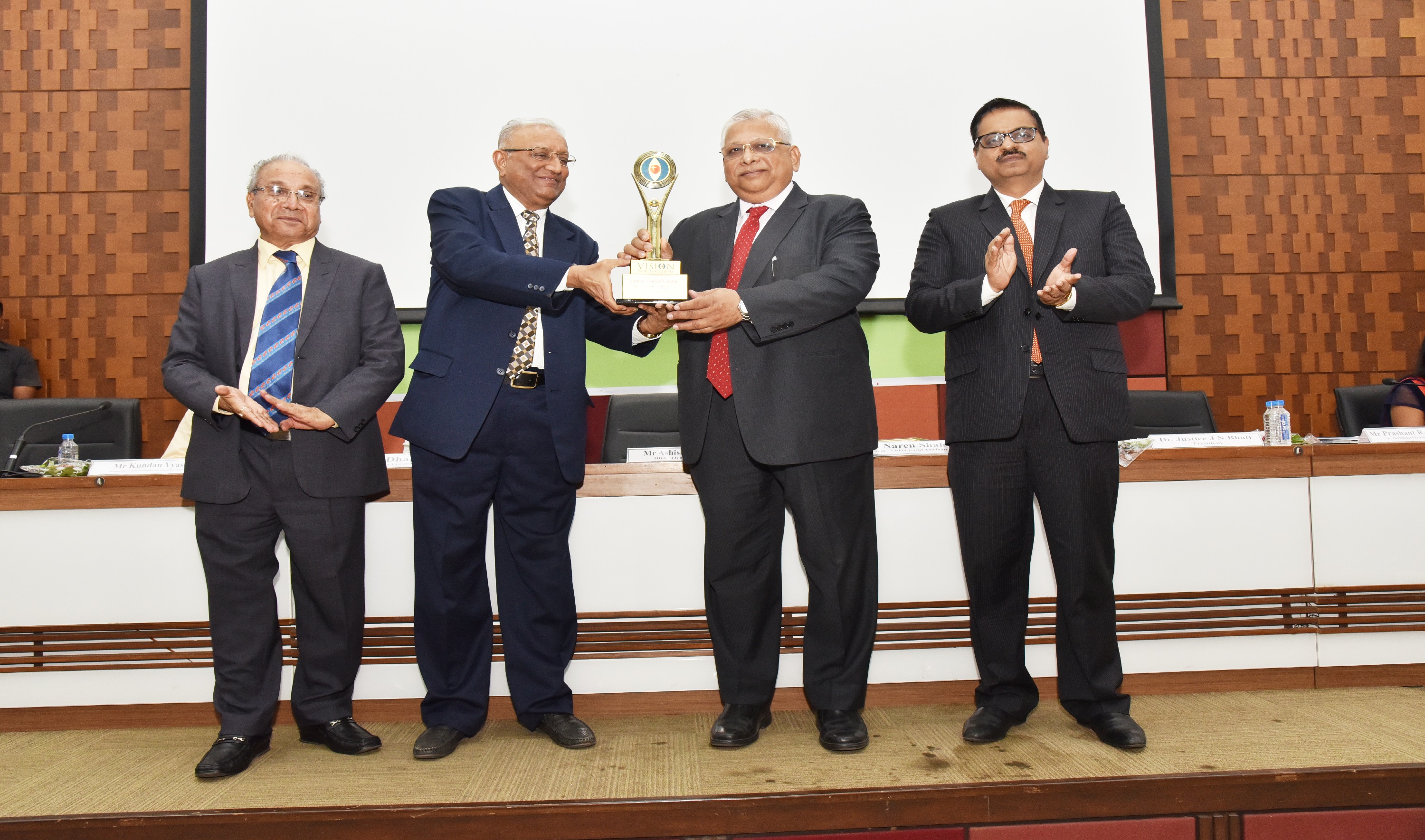EX. Acting Chief Justice Gujarat B.J Sethna is presenting visionary Award to Shri M. Narendra CMD Indian Overseas Bank, Mr. Naren Shah Chairman of Vision world Academy on left.